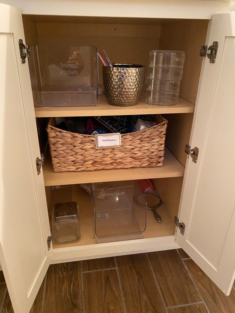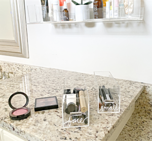 I have a confession to make. Although I’ve organized many bathrooms, including putting beautiful and functional systems in place for my clients’ makeup, skincare, and jewelry collections, I had practically zero organization with the exception of one bin for my skincare products. In fact, I have been using a travel makeup bag for all of my makeup for as long as I can remember. I simply got the bag out, did my makeup, and then dumped it all back in and threw it in the counter under the sink.