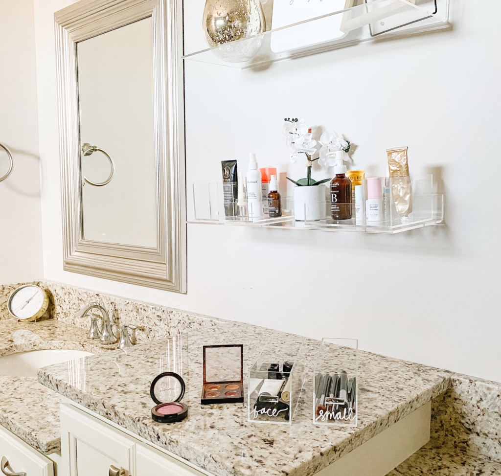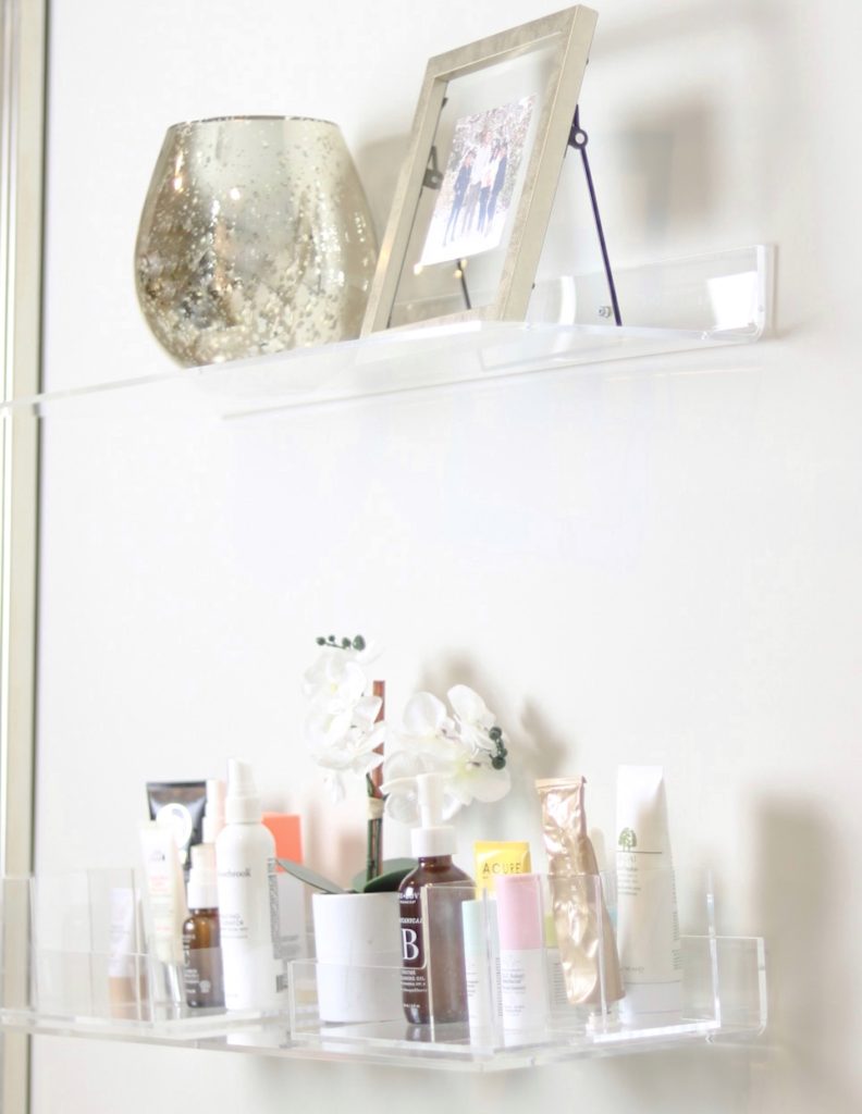 Next, I gave my skincare products on the shelves above a little face lift as well. I used 2 luxe acrylic cosmetic & blush organizers, turned sideways to separate my am and pm products. I didn’t label these because I liked the clean look.
