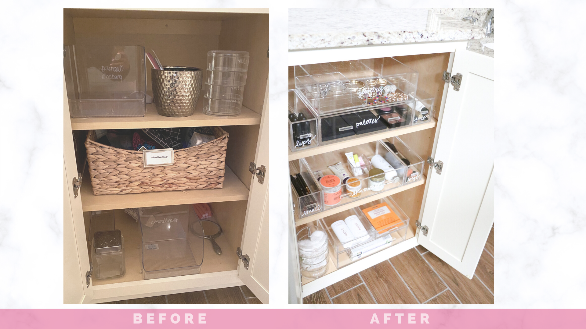 I have a confession to make. Although I’ve organized many bathrooms, including putting beautiful and functional systems in place for my clients’ makeup, skincare, and jewelry collections, I had practically zero organization with the exception of one bin for my skincare products. In fact, I have been using a travel makeup bag for all of my makeup for as long as I can remember. I simply got the bag out, did my makeup, and then dumped it all back in and threw it in the counter under the sink.