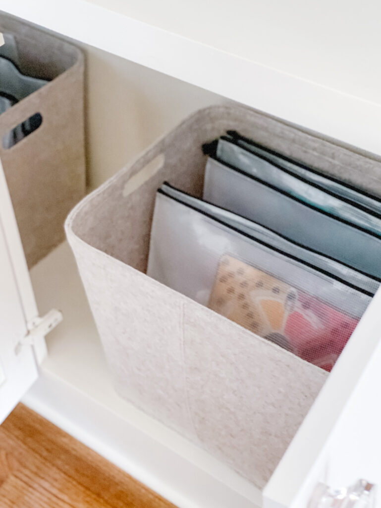 We used multiple sizes, based on needs, and purchased ours from The Container Store. Amazon also has great options which are linked as well.